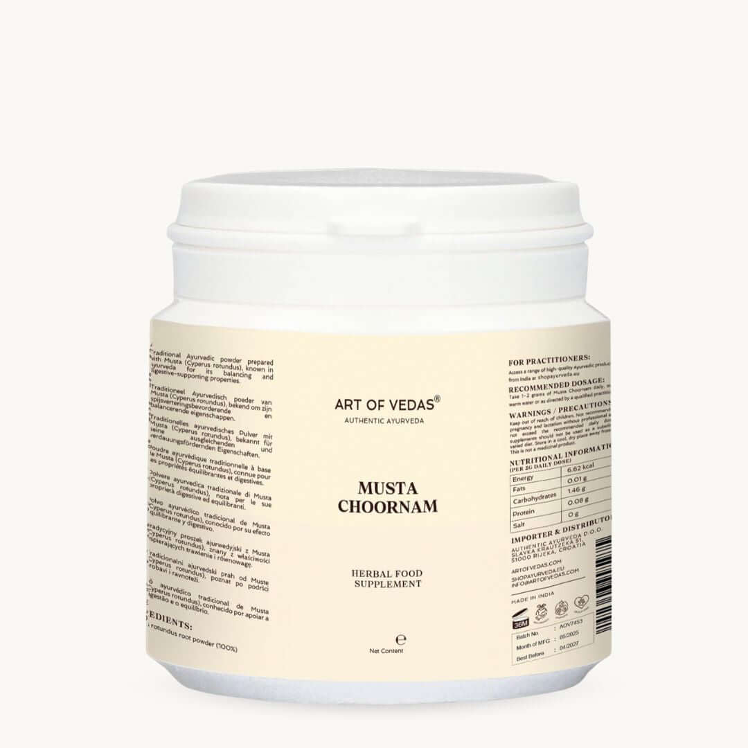 Musta Choornam ist ein klassisches ayurvedisches Pulver, das aus dem Rhizom von Cyperus rotundus hergestellt wird, einem verehrten Kraut, das für seine tiefgreifende Wirkung auf das Verdauungsfeuer (Agni) und das Pitta-Dosha bekannt ist. Traditionell wird es in der Nachsorge, für das Wohlbefinden von Kindern und bei Pitta-Beschwerden verwendet. Es ist eine sanfte und wirksame Formulierung, die nach klassischen ayurvedischen Methoden hergestellt wird.