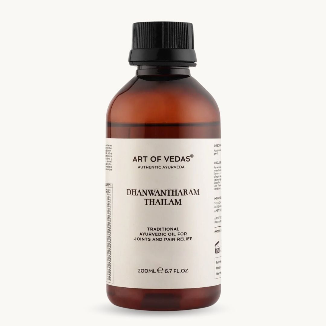 In Ayurvedic tradition, Dhanwantharam Thailam is classified as Balya (strengthening) and Brimhana (nourishing). The formulation contains over 30 herbs including Bala, Ashwagandha, Dashamoola, and Shatavari — each selected according to classical texts for their traditional properties. The oil is prepared using the Ksheerapaka method, incorporating milk in the cooking process, which is believed to enhance its nourishing qualities. Regular Abhyanga with this oil is traditionally considered supportive of muscle tone, skin elasticity, and Vata balance. The sesame oil base is regarded in Ayurveda as deeply penetrating and grounding.