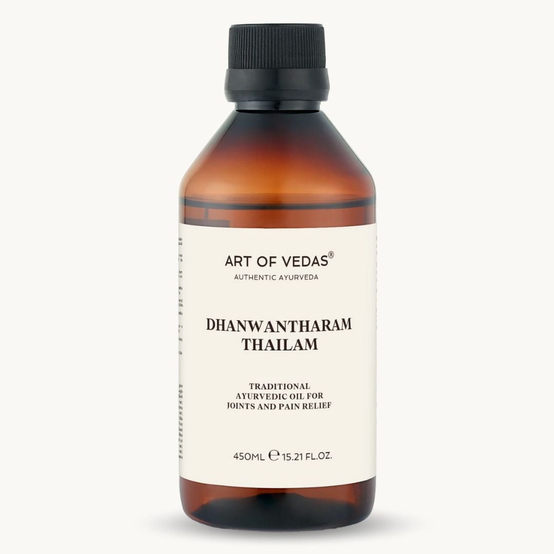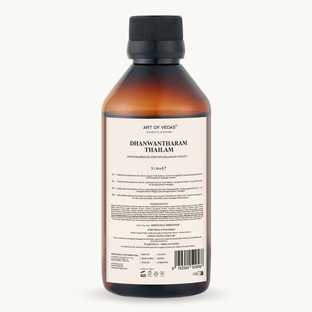 Dhanwantharam Thailam primarily pacifies Vata dosha. Its unctuous (Snigdha), heavy (Guru), and nourishing (Brimhana) qualities directly counter the dry, light, and depleting characteristics of Vata. Unlike some strongly warming oils, Dhanwantharam has a balanced thermal quality, making it suitable for all three doshas when used appropriately. It is considered particularly beneficial during life transitions that aggravate Vata — including pregnancy, postpartum recovery, and periods of physical or emotional depletion.